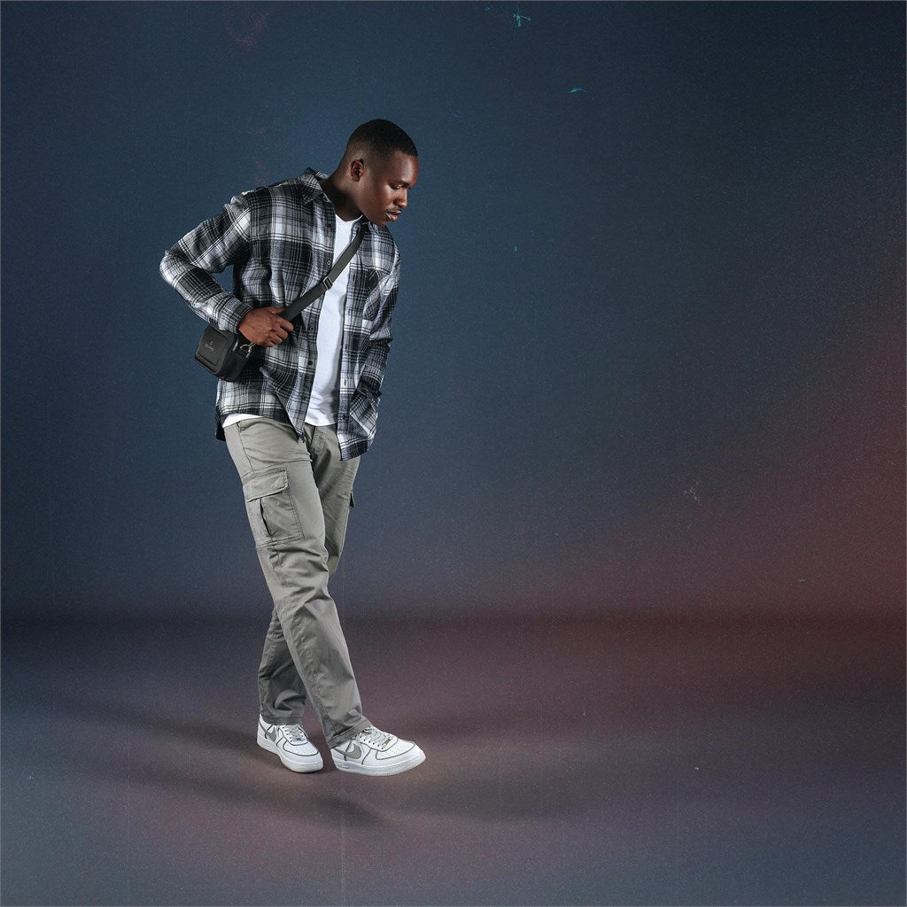 adjustable, detachable ‘seat belt’ styled crossbody strap